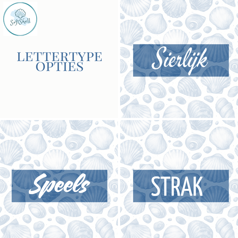 Kies welke naam of namen en eventuele datum je op je schelp wilt. Het is ook mogelijk andere woorden of een korte zin te kiezen. Houd er rekening mee dat deze zin maximaal 5 woorden kan bevatten.